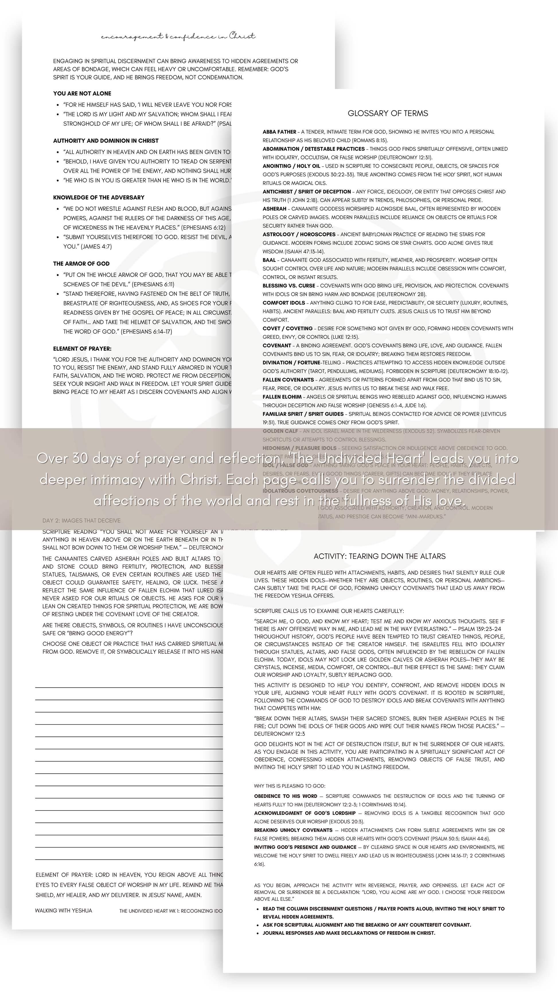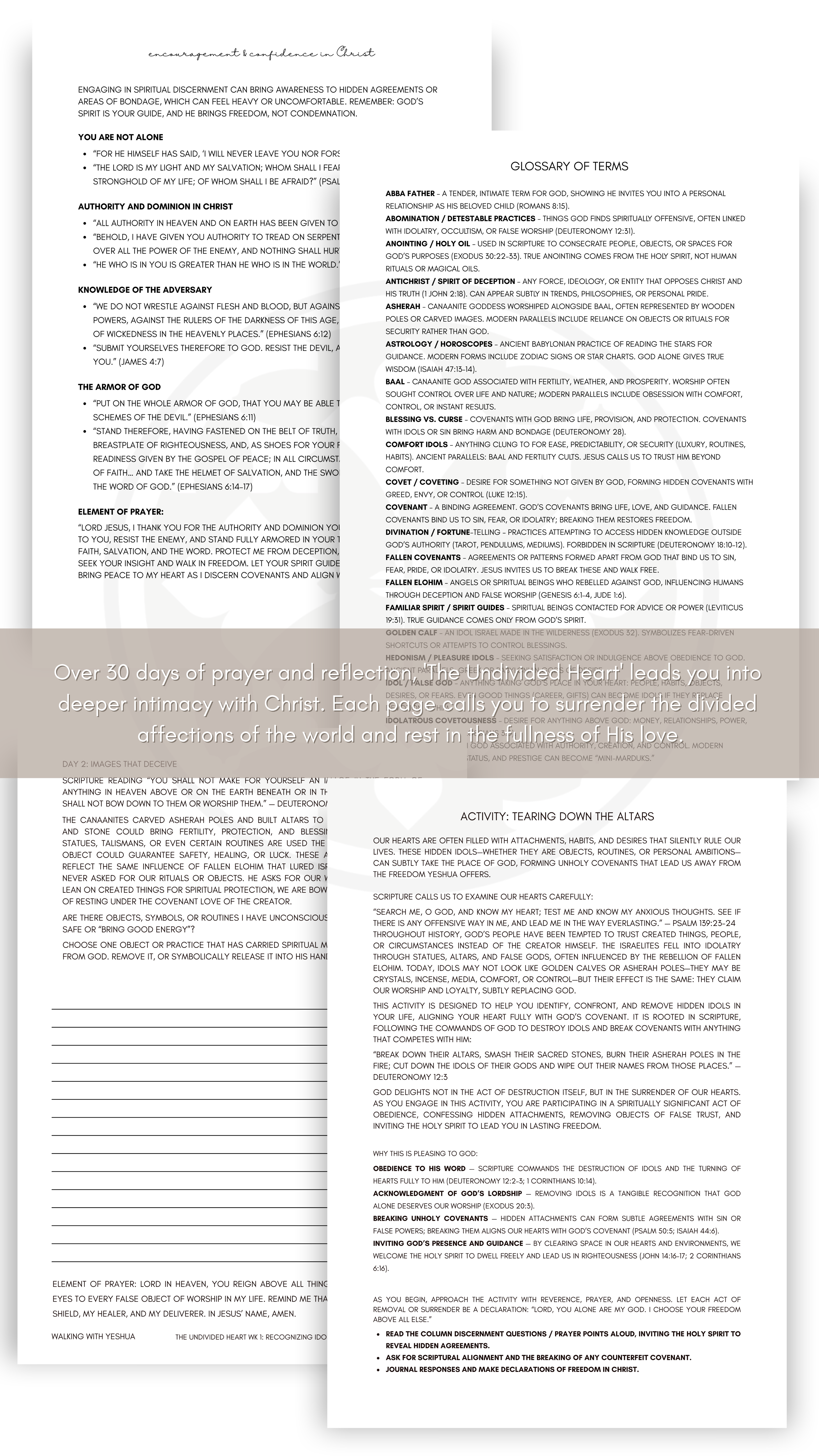 Bring what competes for your heart into the light and hand it over to God. This journal guides you to recognize and release idols, replace them with His truth, and walk in the freedom Christ offers. Write, pray, and experience the joy of a heart fully devoted to Him.
